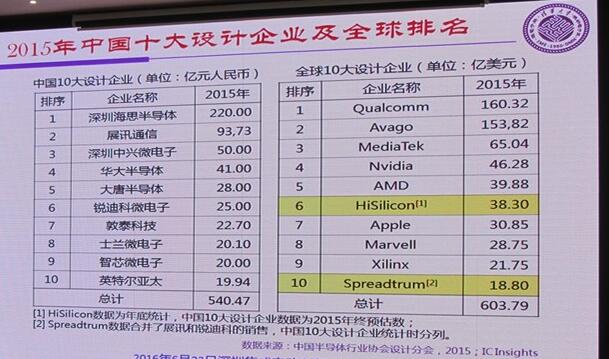 市場研究機構IC Insights的數(shù)據(jù)顯示,2015年世界十大芯片設計公司中,中國的海思和展訊位居第6和第10位,分別是38.3億美元和18.8億美元。根據(jù)中國半導體行業(yè)協(xié)會設計分會的數(shù)據(jù),海思和展訊占據(jù)前兩名,第三至第五名分別是中興微電子、華大半導體、大唐半導體。