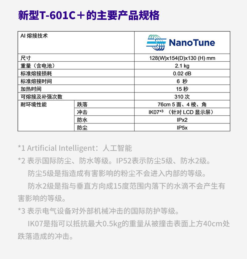 新型T-601C+的產(chǎn)品理念是“無懼干擾,輕松熔接”。產(chǎn)品全新搭載了本公司獨有的AI*1熔接技術“NanoTune”,從而實現(xiàn)了不依賴于作業(yè)人員技能的可操作性,極大提高了光纖網(wǎng)絡施工現(xiàn)場的作業(yè)效率。本公司始終堅持對質量精益求精,在日本國內進行研發(fā)、制造,未來仍將以我們的獨有技術為客戶的熔接作業(yè)提供支持。