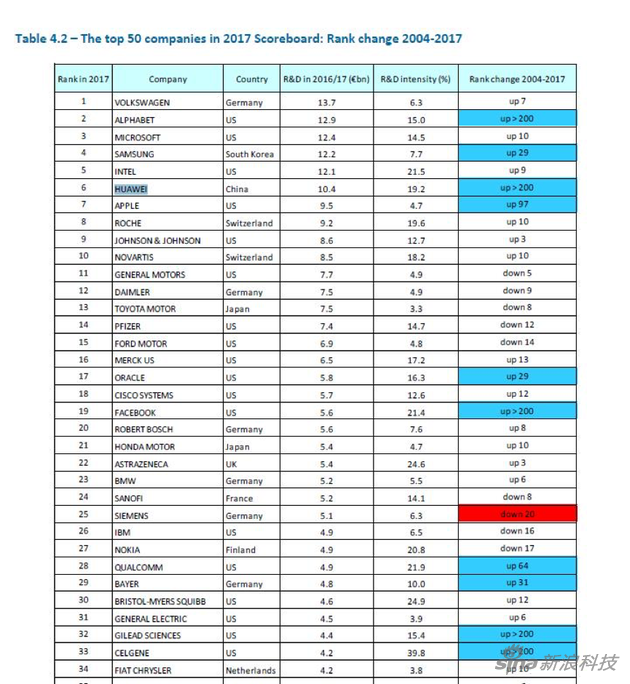 Iccsz訊 近日,歐盟委員會官網發(fā)布“2017全球企業(yè)研發(fā)投入排行榜”,德國大眾連續(xù)四年研發(fā)費用均位居第一位,今年以137億歐元研發(fā)投入蟬聯(lián)榜首,來自美國的谷歌和微軟以129億歐元和124億歐元分列第二名和第三名,其中,華為以104億歐元超過蘋果(95億歐元),排名全球第六、中國第一。
