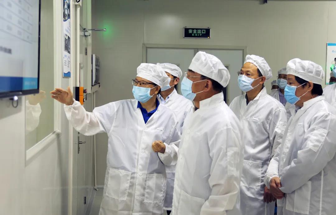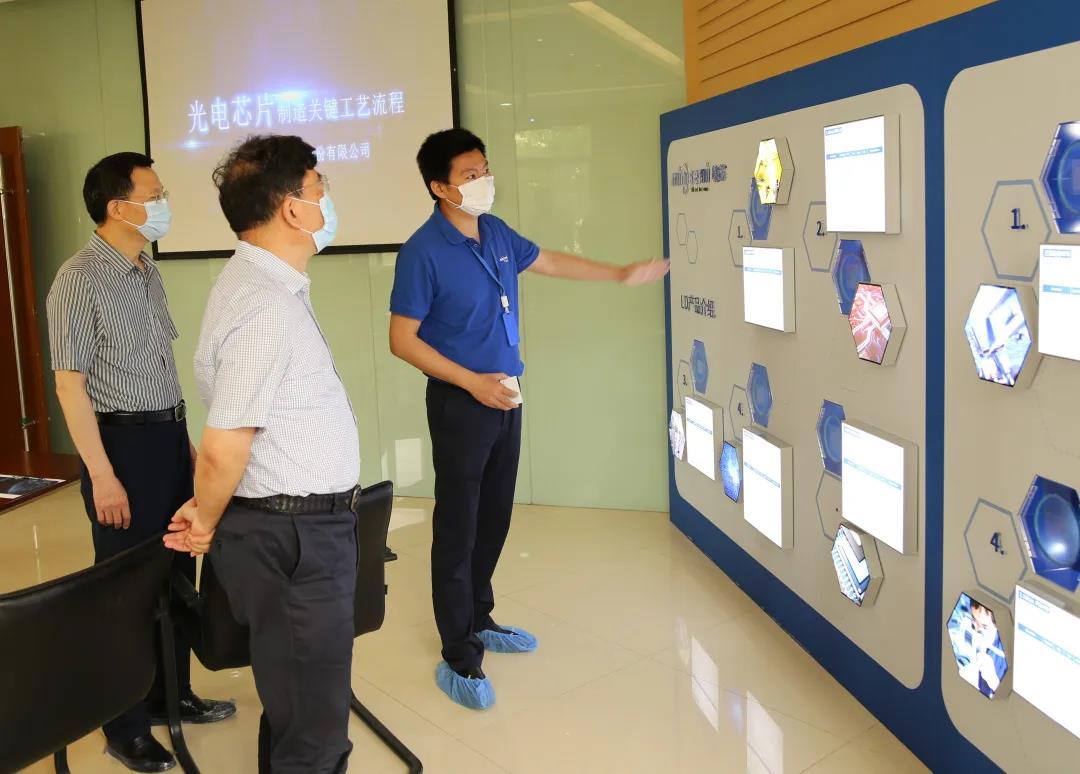 曹廣晶副省長一行首先參觀了公司產(chǎn)品展示墻,張華總對公司產(chǎn)品尤其是面向5G網(wǎng)絡(luò)建設(shè)的25G激光器和探測器芯片應(yīng)用情況作了介紹。隨后,曹廣晶副省長一行認(rèn)真觀看了光芯片關(guān)鍵工藝制造流程的視頻短片,并由王任凡總導(dǎo)覽,重點參觀了公司的芯片生產(chǎn)制造車間,詳細(xì)聽取了光芯片生產(chǎn)各道工序流程的介紹,對產(chǎn)線的設(shè)備、材料、員工情況作了詳細(xì)了解,就公司發(fā)展?fàn)顟B(tài),以及光芯片國產(chǎn)化對5G產(chǎn)業(yè)發(fā)展的支撐作用進行了深入調(diào)研。