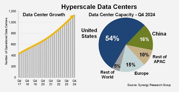 ICC訊 Synergy研究集團(tuán)的最新數(shù)據(jù)顯示,截至2024年底,由超大規(guī)模提供商運(yùn)營的大型數(shù)據(jù)中心數(shù)量已增至1,136個(gè),在過去五年中翻了一番。