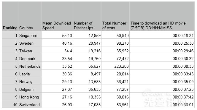 新加坡位列榜首,平均下載速度為55.13 Mbps;其中7個歐洲國家排名前十??偣灿?0個歐洲國家排名前30名,其中7個來自亞洲、美國、加拿大和新西蘭。在新加坡,下載一部高清電影需要18分34秒,而在英國下載一部7.5 GB的電影則需要一個小時的時間。而如果是在也門,則需要兩天兩小時加兩分鐘。