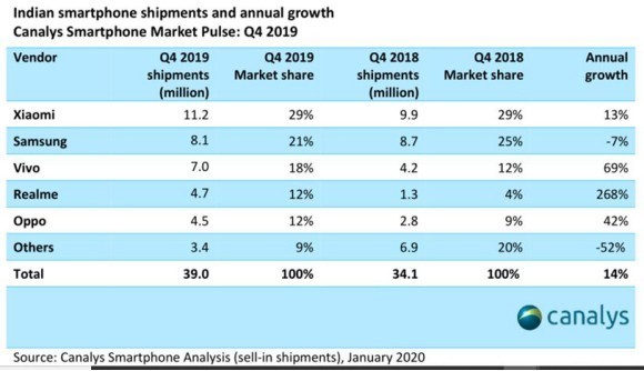ICCSZ訊 市場調(diào)研機(jī)構(gòu)Canalys日前發(fā)布印度手機(jī)市場報告,報告顯示,2019年第四季度印度智能手機(jī)市場增長14%,總出貨量為3,900萬臺。印度智能手機(jī)全年出貨量增長8%,達(dá)到1.48億部。其中小米市場占有率達(dá)到29%,出貨量1120萬臺,增長13%。同時小米連續(xù)10個季度雄踞印度市場榜首。全年出貨量達(dá)到4290萬部。