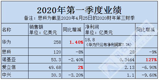 設(shè)備類拿最具代表性的全球五大設(shè)備商——華為、思科、諾基亞、愛立信、中興2020年第一季度業(yè)績來看,除華為、愛立信銷售額微漲,余者一律降降降,凈利潤更是唯有諾基亞在增長(增幅竟高達127%),其余都有不同程度的下滑。