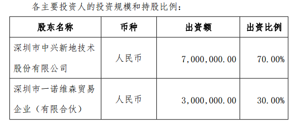 ICCSZ訊 (編輯:Nicole) 近日,深圳市中興新地技術(shù)股份有限公司(以下簡稱:中興新地)發(fā)布《關(guān)于公司擬出資設立控股子公司的公告》。據(jù)公告稱,中興新地擬與深圳市一諾維森貿(mào)易企業(yè)(有限合伙)共同出資設立控股子公司——深圳市新地精密技術(shù)有限公司(以下簡稱:新地精密技術(shù)),注冊資本為人民幣 1千萬元,其中中興新地出資7百萬元,占注冊資本的 70.00%,深圳市一諾維森貿(mào)易企業(yè)(有限合伙)出資3百萬元,占注冊資本的 30%。本次對外投資不構(gòu)成關(guān)聯(lián)交易。
