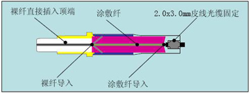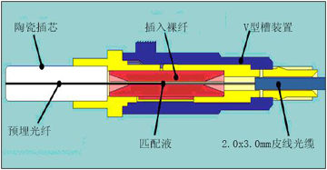 b)預(yù)埋纖結(jié)構(gòu) 預(yù)埋纖結(jié)構(gòu)采用的是在工廠將一段裸纖預(yù)先置入陶瓷插芯內(nèi),并將頂端進(jìn)行了研磨,操作者在現(xiàn)場只需要將另一端切割好光纖后插入即可;由于預(yù)埋結(jié)構(gòu)前面預(yù)埋纖工廠研磨且對接處填充匹配液,不過分依賴光纖端面切割的平整度,大大降低了對操作者熟練程度的要求;由于接頭的端面采用的是預(yù)先研磨的工藝,因此回波損耗指標(biāo)好;產(chǎn)品結(jié)構(gòu)原理如下:
