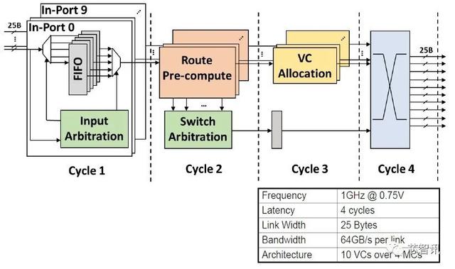 這是一個十端口直通路由器。2D 網(wǎng)格以 1 GHz 運行,需要四個周期來遍歷路由器。它有 10 個虛擬通道和四種不同的消息類別,Jason Howard表示這可以避免網(wǎng)格上的任何死鎖,并且為路由器內(nèi)的每個鏈路提供 64 GB/秒的速度。