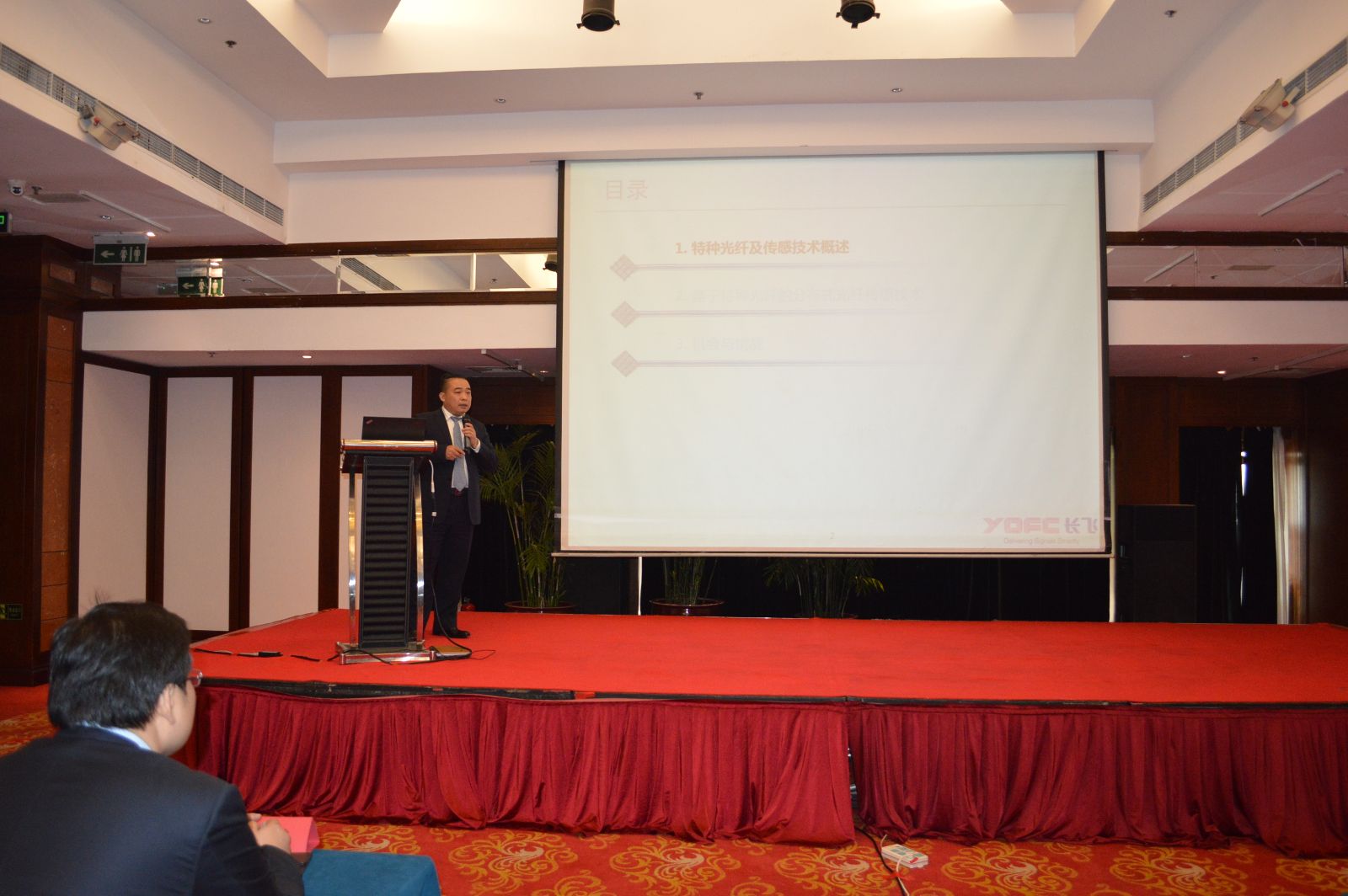 短暫的茶歇結(jié)束之后,由國內(nèi)光纖光纜龍頭企業(yè)長飛公司的特種產(chǎn)品事業(yè)部總經(jīng)理童維軍為大家?guī)怼豆饫w傳感用特種光纖》的演講。
