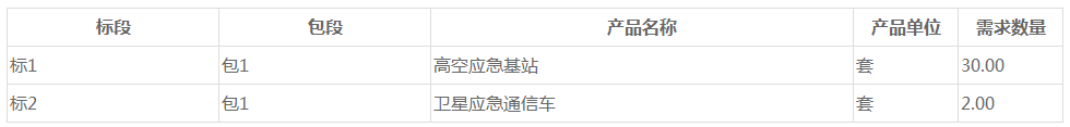 標1高空應(yīng)急基站需求30套,標2衛(wèi)星應(yīng)急通信車2套。具體標段包段如下圖: