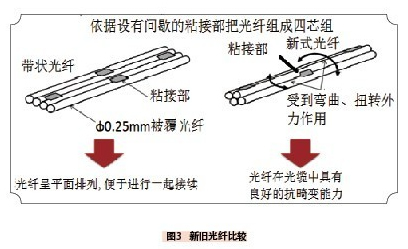 在使用多纖芯光纜去構(gòu)筑光通信網(wǎng)的情況下,為了提高光纖接續(xù)效率,常采用讓多個(gè)光纖一起接續(xù)的技術(shù)。為此,國(guó)內(nèi)外廣泛采用帶狀光纖。然而傳統(tǒng)的帶狀光纖結(jié)構(gòu)靈活性欠佳,在高密度情況,當(dāng)外力作用于光纖上就易出現(xiàn)光纖斷裂和光信號(hào)損失增加的可能性。出于這個(gè)原因,對(duì)高密度多纖芯光纜的直徑,維持抑制體積應(yīng)變和多纖芯一起接續(xù)的平衡是一個(gè)非常重要的課題。NTT新開(kāi)發(fā)出的這種光纜,不是采用0.25mm被覆、四芯帶狀光纖,而是采用了間歇粘貼式四芯組光纖,如圖3所示。這種間歇粘貼式四芯組光纖,可以在高密度光纜中靈活應(yīng)付光纜變形,而且還可以同傳統(tǒng)光纜的四芯帶狀光纖一起接續(xù)。