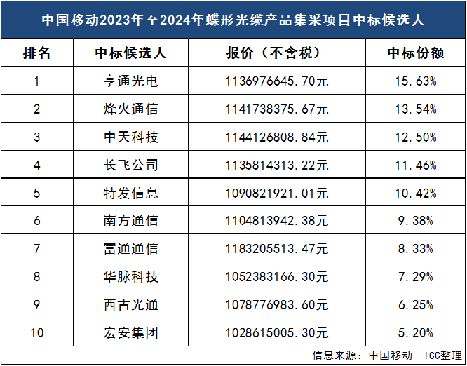 ICC訊 6月6日消息,中國移動發(fā)布2023-2024年蝶形光纜產(chǎn)品集采項目中標候選人名單,亨通光電、烽火通信、中天科技、長飛公司、特發(fā)信息、華脈科技等十家企業(yè)成功中標入圍,具體排名、份額及報價如下: