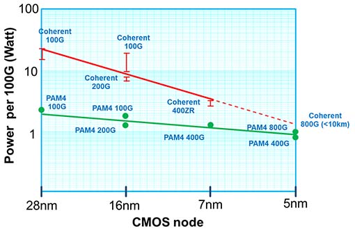 對于這些收發(fā)器功耗的最大來源是DSP所產(chǎn)生的功耗。新型半導(dǎo)體的制程節(jié)點(diǎn)不僅提供更高的處理速度,也可以減少特定類型傳輸?shù)墓囊?。圖1是相干和PAM4 DSP在不同CMOS節(jié)點(diǎn)的功耗表現(xiàn)。100G相干比100G PAM4高出近10倍的功耗,但這種差異會在基于5nm節(jié)點(diǎn)800G應(yīng)用明顯降低。