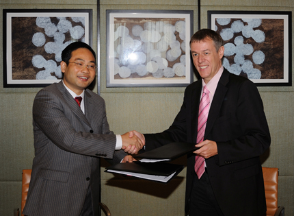 華為無線產(chǎn)品線副總裁鄭葉來(左),與AIRCOM International首席技術(shù)官 Ricky Watts簽署技術(shù)合作協(xié)議。