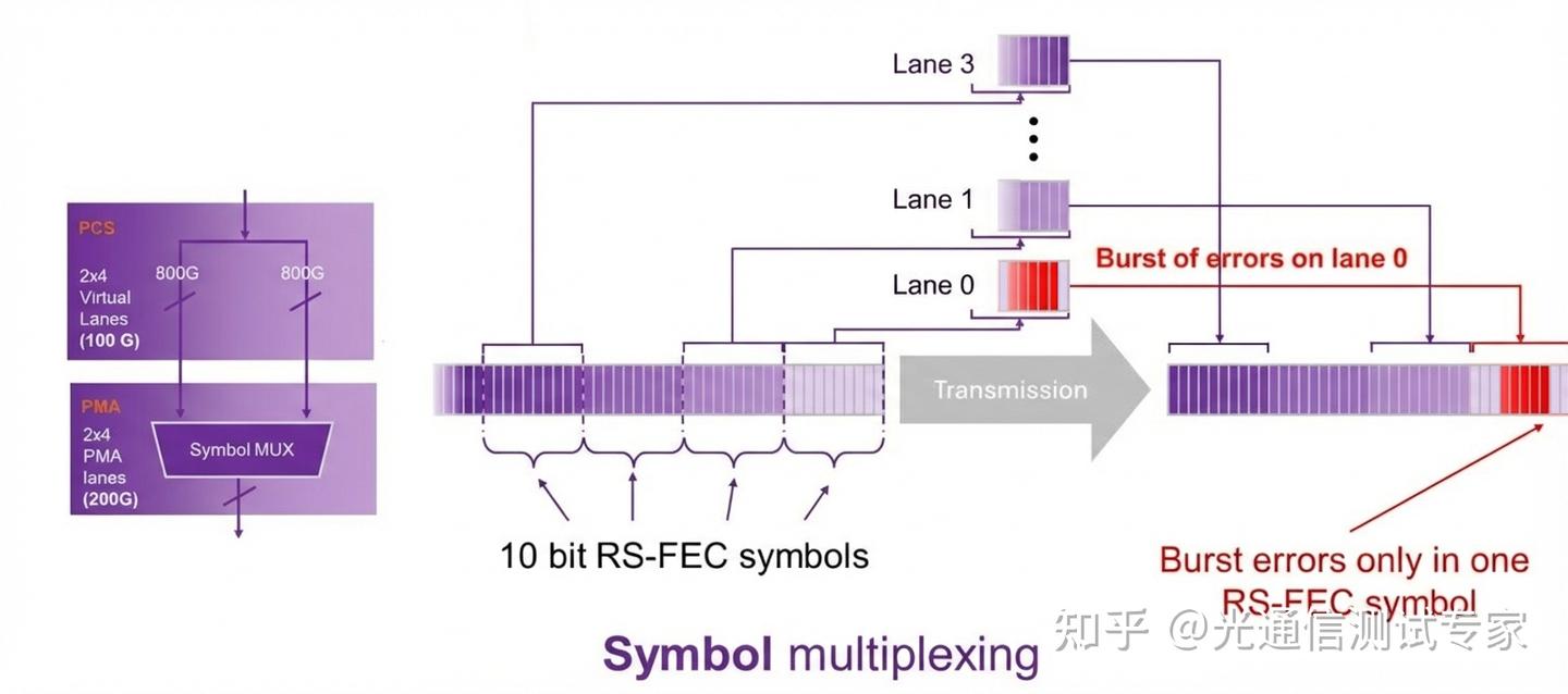 抑制錯誤擴散:在傳統(tǒng)的“位復用”模式下,單一物理通道上的一個長突發(fā)錯誤會被分散到多個FEC符號周期中。由于RS-FEC每條碼字最多只能糾正15個符號錯誤,這種錯誤的擴散極易導致碼字不可糾正,從而引發(fā)鏈路失效。錯誤遏制(Error Containment):符號復用確保來自單一物理通道的突發(fā)錯誤被限制在盡可能少的FEC符號周期內(nèi)(理想情況下僅為一個符號)。這種“將雞蛋放在一個籃子里”的策略,反而保護了整個FEC碼字的完整性,顯著提高了糾錯成功率。