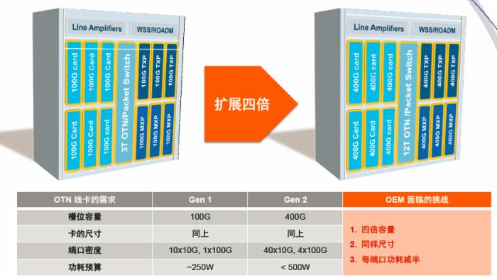 為了響應(yīng)市場需求,PMC推出了DIGI-G4芯片, 配合業(yè)界首款單芯片的400G OTN處理器解決方案,可實現(xiàn)四倍的線卡擴(kuò)展,同時降低功耗50%。并且可應(yīng)用于大規(guī)模數(shù)據(jù)中心互聯(lián)當(dāng)中。
