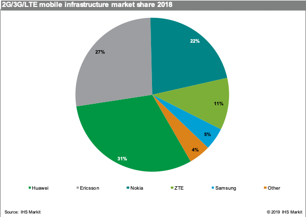 從設備商來看,華為、愛立信、諾基亞、中興和三星五家設備商幾乎瓜分了全球移動基礎設施市場。華為以31%的份額占據(jù)2018年全球移動基礎設施市場(包括2G、3G和4G硬件宏蜂窩網(wǎng)絡)市場霸主地位,緊隨其后的是占比為27%的愛立信和占比為22%的諾基亞。中興通訊市場份額為11%,韓國三星份額為5%。