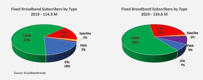 寬帶領(lǐng)域的變化如此之多,我們就說(shuō)到這里吧。事實(shí)是,光纖無(wú)疑正在增長(zhǎng),但在2024年,固定無(wú)線接入(FWA)新增的用戶數(shù)量幾乎與光纖到戶(FTTH)持平。仍有近1000萬(wàn)用戶使用DSL。對(duì)于那些尚未在這些市場(chǎng)推出光纖服務(wù)的寬帶服務(wù)提供商來(lái)說(shuō),要小心了——你們的市場(chǎng)正成為Gigapower等批發(fā)提供商的目標(biāo)。