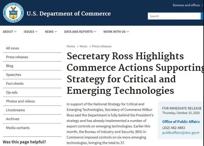 ICC訊 近日,美國(guó)商務(wù)部工業(yè)安全局(BIS)宣布將六項(xiàng)新興技術(shù)添加到《出口管理?xiàng)l例》(EAR)的商務(wù)部管制清單(CCL)中。美國(guó)商務(wù)部在官網(wǎng)發(fā)布公告中寫(xiě)道:“此舉是為了支持關(guān)鍵及新興技術(shù)這一國(guó)家戰(zhàn)略”。