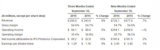 Iccsz訊(編輯:Aiur) 美國(guó)當(dāng)?shù)貢r(shí)間10月27日,納斯達(dá)克上市公司IPG光電公布了其截至9月30日的2016財(cái)年第三季度報(bào)告。報(bào)告披露IPG該季度營(yíng)收2.66億美元(以下貨幣單位為美元),同比增長(zhǎng)9%,毛利率54.4%,同比略減0.3%;營(yíng)業(yè)利潤(rùn)9410萬元,同比增長(zhǎng)5%;IPG光電部門貢獻(xiàn)的凈收入為6920萬元,同比增長(zhǎng)10%。