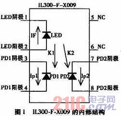 當(dāng)IL300-F-X009內(nèi)部的LED中流過電流IF時(shí),其所發(fā)出的光會(huì)在PD1和PD2中感應(yīng)出正比于LED發(fā)光強(qiáng)度的光電流Ip1和Ip2,其中IF、Ip1、Ip2滿足以下關(guān)系式: