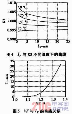 本試驗(yàn)選取VCC和VDD都為+5 V,但不共地的電源電壓,Vin的輸入電壓范圍0 V~5 V,Vout的輸出電壓范圍0 V~5 V,如圖2所示。根據(jù)IL300芯片手冊(cè)說明,如圖4和圖5所示,可知,在環(huán)境溫度為25℃,流過IL300-F-X009內(nèi)的發(fā)光二極管LED的正向電流為IF=10 mA時(shí),其傳輸增益K3=1,發(fā)光二極管LED的正向電壓VF=1.25 V。設(shè)輸入電壓Vin=5 V,則第一級(jí)運(yùn)放LM358輸出的電壓V1=5 V,因此,由以上分析可以計(jì)算出R2的電阻值。