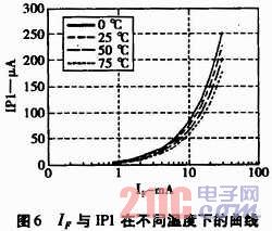 根據(jù)IL300芯片手冊(cè)說明,如圖6所示,可知,在環(huán)境溫度為25℃,當(dāng)流過IL300-F-X009內(nèi)的發(fā)光二極管LED的電流IF=10 mA時(shí),則Ip1= 70μA,此時(shí),V2=Vin=5 V,因此,可以計(jì)算出R1的電阻值。由式(1)可知,要實(shí)現(xiàn)Vout=Vin,那么R3=R1。