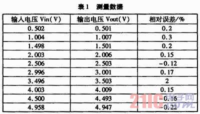 本文所設(shè)計(jì)的電壓檢測(cè)隔離電路用于對(duì)5 V以下電壓進(jìn)行檢測(cè)與隔離,通過多次實(shí)驗(yàn)比較,最后,選取R1=50 kΩ、R2=240 Ω和R3=50 kΩ,可在較大程度上提高檢測(cè)電路的精確性,此電壓檢測(cè)隔離電路基本實(shí)現(xiàn)了Vout與Vin相等。由表1可看出,相對(duì)誤差均在-0.5%~+0.5%范圍內(nèi)。通過實(shí)驗(yàn)測(cè)量數(shù)據(jù)可以發(fā)現(xiàn),線性光耦I(lǐng)L300-F-X009隔離電路有很好的穩(wěn)定性和線性。