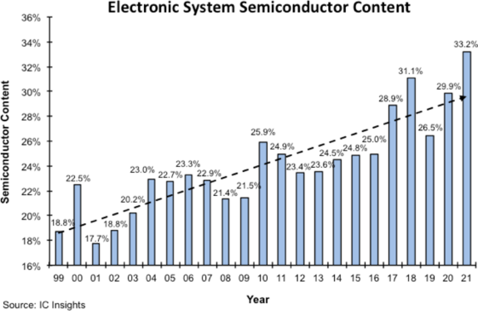 2017年之前,2010年是電子系統(tǒng)中的半導(dǎo)體含量最高的年份,為25.9%。這一數(shù)字被 2017年的28.9%輕松超越。如上圖所示,半導(dǎo)體含量在2018年再次大幅躍升,創(chuàng)下 31.1%的新高。2021年半導(dǎo)體銷售額增長25%,受此推動(dòng),電子系統(tǒng)中的半導(dǎo)體含量在去年達(dá)到了前所未有的33.2%。