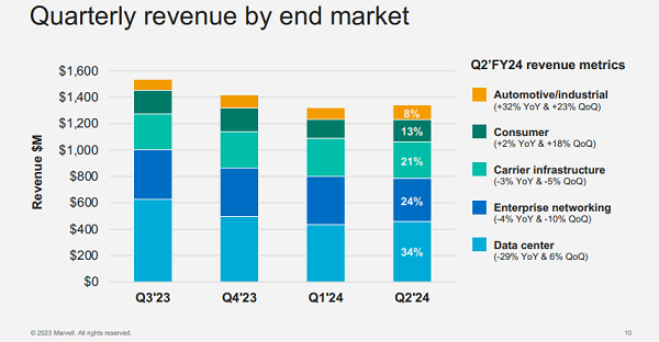 ICC訊(編譯:Nina)美國加州Santa Clara,2023年8月24日--數(shù)據(jù)基礎(chǔ)設(shè)施半導(dǎo)體解決方案的領(lǐng)導(dǎo)者Marvell Technology公司(納斯達(dá)克:MRVL)公布了其截至2023年7月29日的2024財年第二季度財務(wù)業(yè)績。