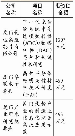 【訊石光通訊咨詢網(wǎng)】近期,由廈門市科技局推薦的4個2013年國家“863計劃”、國家科技支撐計劃高新技術(shù)領(lǐng)域項目共有3個獲得立項,其中廈門優(yōu)迅高速芯片有限公司的“下一代光傳輸系統(tǒng)中高速模數(shù)轉(zhuǎn)換(ADC)/數(shù)模轉(zhuǎn)換(DAC)芯片和關(guān)鍵技術(shù)研究”獲得1307萬元,資助金額超過深圳華為;廈門華聯(lián)電子牽頭的“高效半導(dǎo)體照明關(guān)鍵材料技術(shù)研發(fā)(三期)”獲得資助460萬元;廈門產(chǎn)業(yè)研術(shù)研究院牽頭的“廈門優(yōu)勢產(chǎn)業(yè)的制造業(yè)信息化綜合集成應(yīng)用示范”獲得資助463萬元。