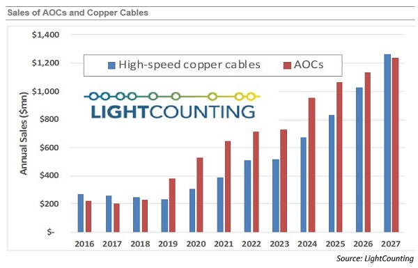 如下圖所示,作為服務(wù)器連接以及在解耦合式交換機(jī)和路由器中用作互連,AOC(有源光纜)和銅纜的銷售不斷增長(zhǎng)。許多低速(25G及以下)線纜現(xiàn)在也用于工業(yè)甚至消費(fèi)應(yīng)用,但這些細(xì)分市場(chǎng)不包括在LC報(bào)告中。