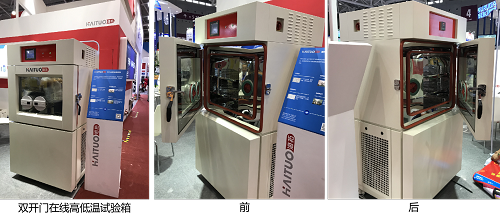 本次展會(huì),節(jié)能降本是海拓儀器希望向業(yè)界客戶傳遞的理念,尤其是新產(chǎn)品雙開門在線高低溫試驗(yàn)箱。傳統(tǒng)產(chǎn)品需要先升溫除霜再降溫,而新產(chǎn)品以創(chuàng)新性雙開門設(shè)計(jì)(前后開門)和首創(chuàng)操作孔設(shè)計(jì),操作不開門,場(chǎng)地更節(jié)約,可長(zhǎng)期在線低溫運(yùn)行,測(cè)試箱內(nèi)無(wú)需除霜,還有雙視窗設(shè)計(jì),使前后雙工位操作,很大程度提升生產(chǎn)測(cè)試效率。
