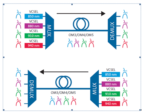 在這場競爭中,還有另一種收發(fā)器傳輸技術(shù),短波分復(fù)用(SWDM)收發(fā)器。與用于40G鏈路的BiDi類似,SWDM收發(fā)器僅需要一個兩芯LC雙工連接,不同的是SWDM每根光纖工作在850nm到940nm之間的4個不同的波長上,其中一根光纖專用于傳輸信號,另一根光纖專用于接收信號。