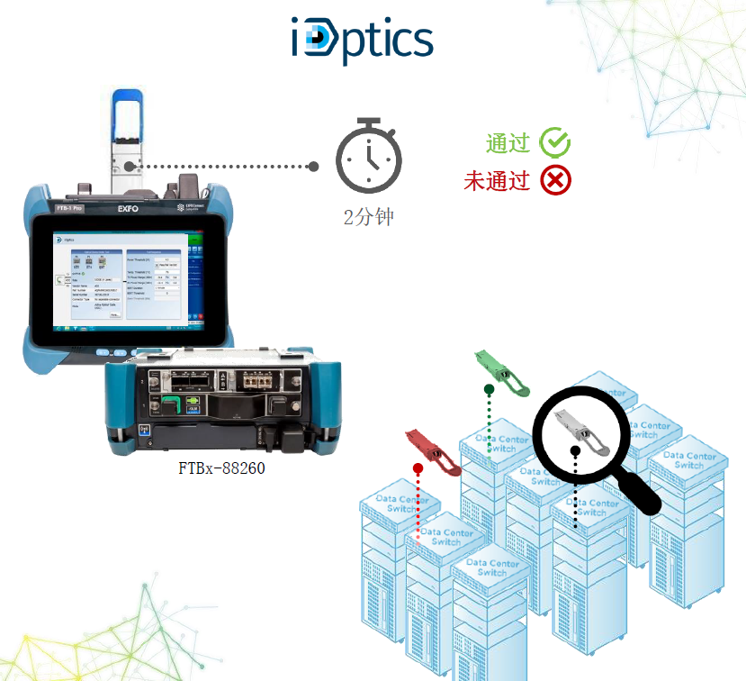 ? EXFO的iOptics使數(shù)據(jù)中心技術(shù)人員能夠在現(xiàn)場快速驗(yàn)證光模塊,并滿足雄心勃勃的部署時(shí)間表。iOptics生成一份測試報(bào)告,技術(shù)人員可以使用該報(bào)告向光模塊供應(yīng)商顯示哪些器件出現(xiàn)故障