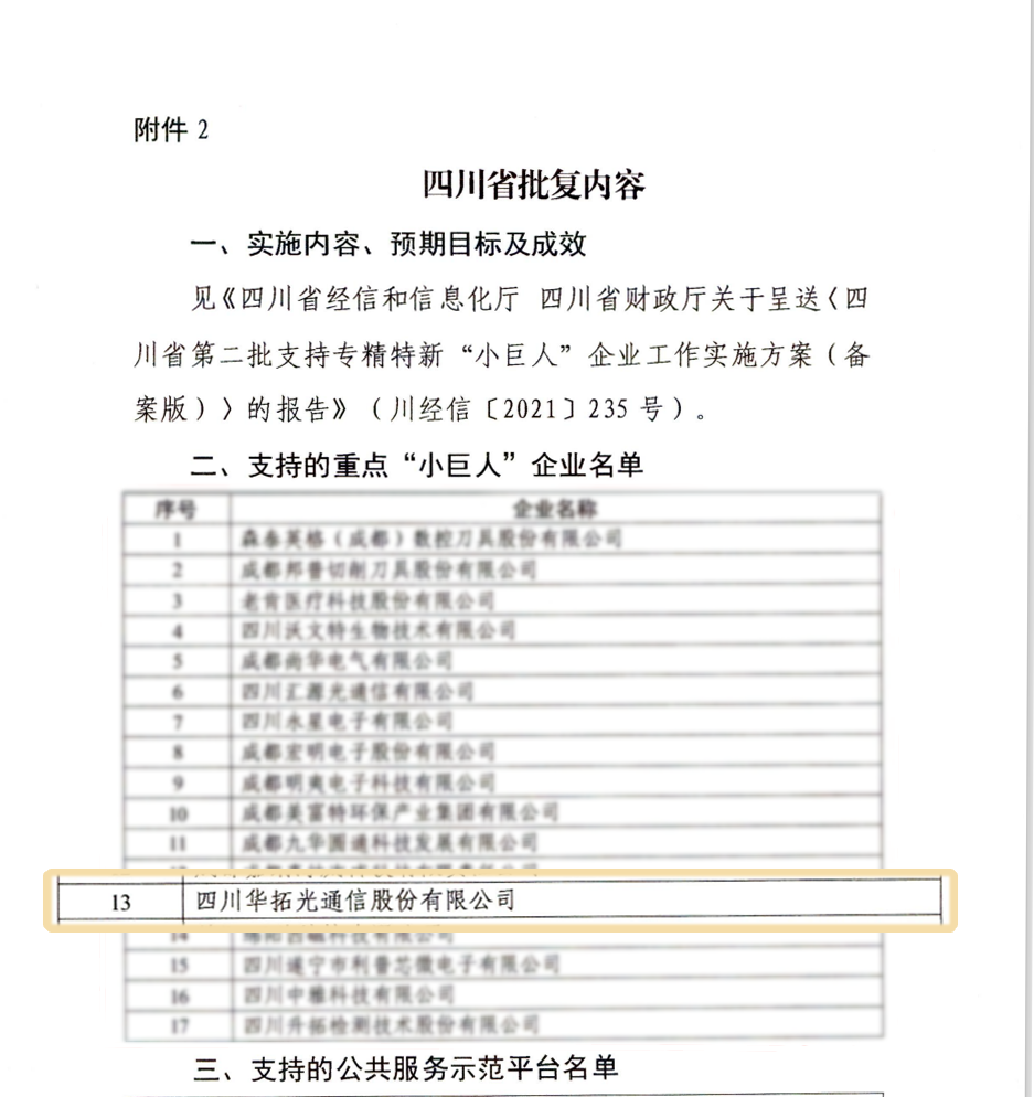 ICC訊 華拓光通信入選財(cái)政部、工信部第二批支持的專精特新“小巨人”企業(yè)名單,是四川省入圍的17家企業(yè)之一。