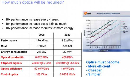 如果通過(guò)“光連接”,每Gb帶寬的能耗將僅為1mW,而每Gb的帶寬成本也只需2.5美分—與當(dāng)前的$10美元相比,優(yōu)勢(shì)相當(dāng)明顯。