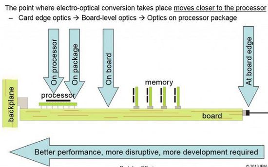 展示了硅光子技術(shù)的當(dāng)前進(jìn)展,連接器是被整合到主板端。而IBM的最新研究,已經(jīng)成功地將硅光陣列整合到了與CPU相似的封裝之中—盡管暫未與CPU整合到一起。