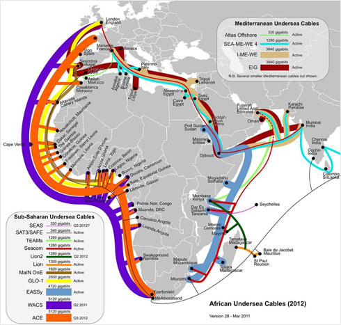 報告稱,海底光纜市場的關(guān)鍵增長驅(qū)動力是帶寬增長。目前非洲的互聯(lián)網(wǎng)滲透率比世界其他國家低。2015年,非洲的滲透率為29.52%,而其他地區(qū)近50%。這清晰表明非洲具有電信擴(kuò)張的重要潛力。伴隨非洲企業(yè)的增加數(shù)量,互聯(lián)網(wǎng)活動的需求必然增長。為了占據(jù)市場潛力,電信運(yùn)營商和網(wǎng)絡(luò)服務(wù)供應(yīng)商需要提供滿足客戶對可靠電網(wǎng)及增加帶寬等需求的產(chǎn)品。2001年,非洲鋪設(shè)了第一條海纜—SAT-3/WASC 海底電纜。