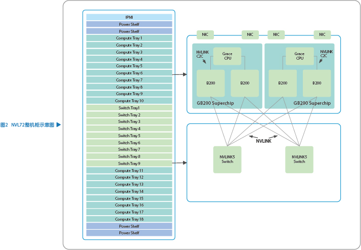 NVL72是英偉達(dá)推出的機(jī)柜級(jí)超節(jié)點(diǎn),整個(gè)系統(tǒng)由18個(gè)Compute Tray和9個(gè)Switch Tray構(gòu)成(見(jiàn)圖2)。1個(gè)Compute Tray包含2個(gè)GB200超級(jí)芯片(Superchip),每個(gè)GB200超級(jí)芯片有2個(gè)Blackwell系列的B200 GPU,整個(gè)機(jī)柜共72個(gè)Black- well GPU。同時(shí)每個(gè)Compute Tray提供4個(gè)網(wǎng)絡(luò)接口卡(NIC)用于Scale-out方向的擴(kuò)展。1個(gè)Switch Tray包含2顆NVLINK Switch芯片,整個(gè)機(jī)柜提供18個(gè)NVLink Switch芯片。整機(jī)柜后部通過(guò)線纜將Compute Tray和Switch Tray進(jìn)行互聯(lián)。