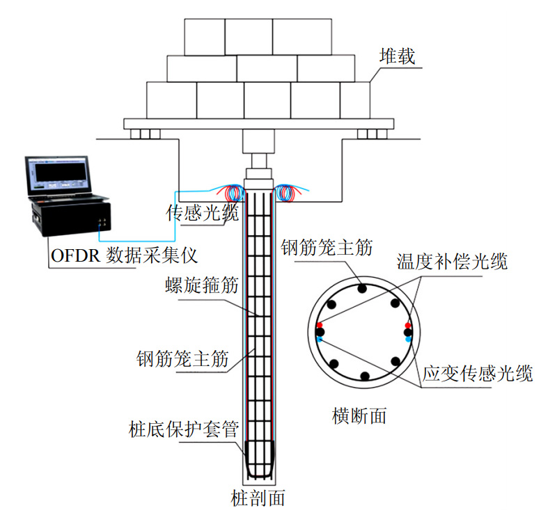試驗裝置及光纖的布設(shè)示意圖如圖1所示。試驗樁為鉆孔灌注樁,樁長為30m、樁徑為600mm、樁身混凝土強(qiáng)度等級為C35,試驗場內(nèi)30m深度范圍內(nèi)地層主要由黏性土和粉性土組成。采集儀為4通道的OSI-S高精度高分辨OFDR光纖解調(diào)儀,空間分辨率采用1cm。應(yīng)變光纖傳感器和溫度補償光纖傳感器是呈“U”形鋪設(shè)鋼筋籠兩根對稱主筋上的。
