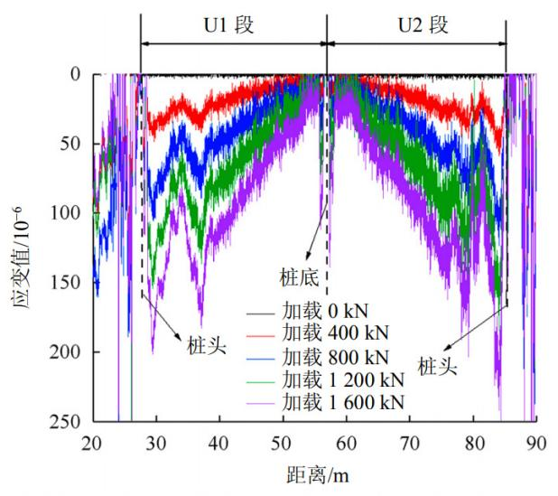 灌注試樁依次經(jīng)歷400、800、1200、1600kN四級加載,而后經(jīng)歷800、400、0kN三級卸載,灌注樁在豎向荷載作用下發(fā)生樁身變形,通過OFDR光纖傳感技術(shù)測得光纖原始應(yīng)變數(shù)據(jù)。