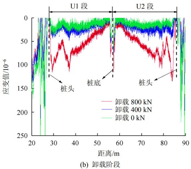 圖2為儀器采集的光纖原始應(yīng)變數(shù)據(jù),可以看出加載和卸載階段,U1段和U2段的應(yīng)變大致呈對稱,這是由于傳感光纖呈“U”形布設(shè)。