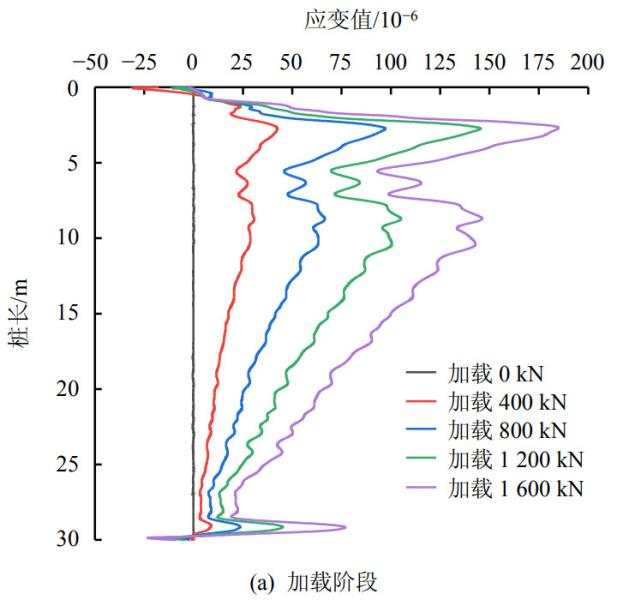 應(yīng)變最大值出現(xiàn)在樁深3.0m左右處,樁身壓應(yīng)變整體趨勢隨著土體埋深的增加而逐漸減小,最終樁身應(yīng)變樁底處逐漸趨于0。在樁長為5.0~7.5m范圍內(nèi),樁身應(yīng)變曲線出現(xiàn)明顯的不規(guī)則內(nèi)凹,主要原因有兩點:一是土體存在一層硬殼層,二是此處光纖綁扎在澆灌混凝土?xí)r發(fā)生松動,該處光纖未能與樁體協(xié)調(diào)變形導(dǎo)致此范圍內(nèi)的應(yīng)變曲線偏小。