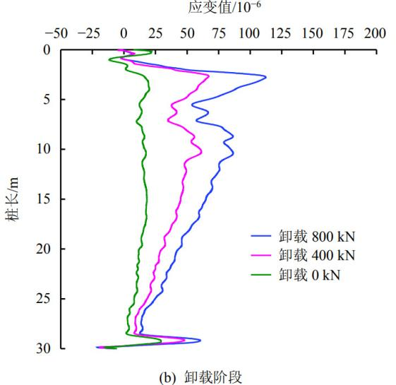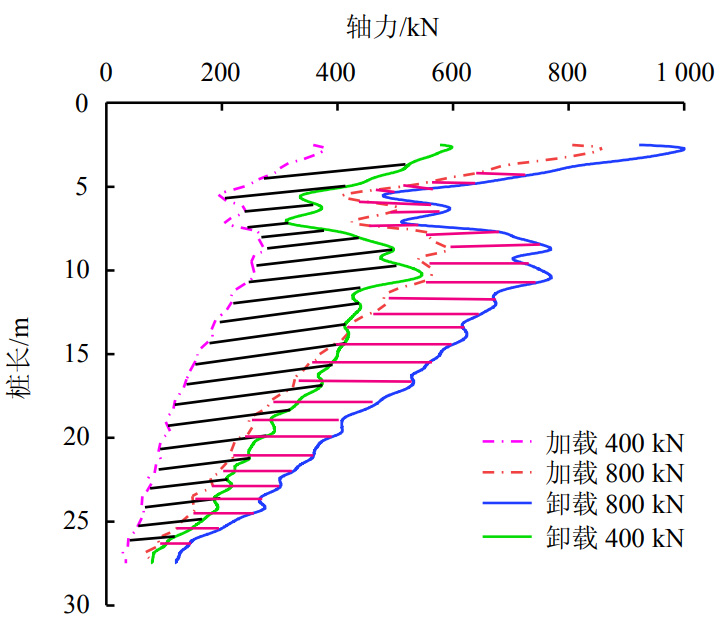 圖4. 相同荷載下樁身軸力加載卸載對比