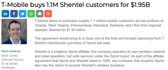 去年,T-Mobile表示要這樣做,但兩家公司未能就交易價格達(dá)成一致。之后,兩家公司將這個問題提交給三家獨立的“估值供應(yīng)商”。供應(yīng)商對Shentel業(yè)務(wù)的估值約為21億美元,T-Mobile同意按照最初的附屬公司協(xié)議的條款,以大約90%的價格,即19.5億美元現(xiàn)金收購Shentel。兩家公司預(yù)計將于第二季度完成交易。
