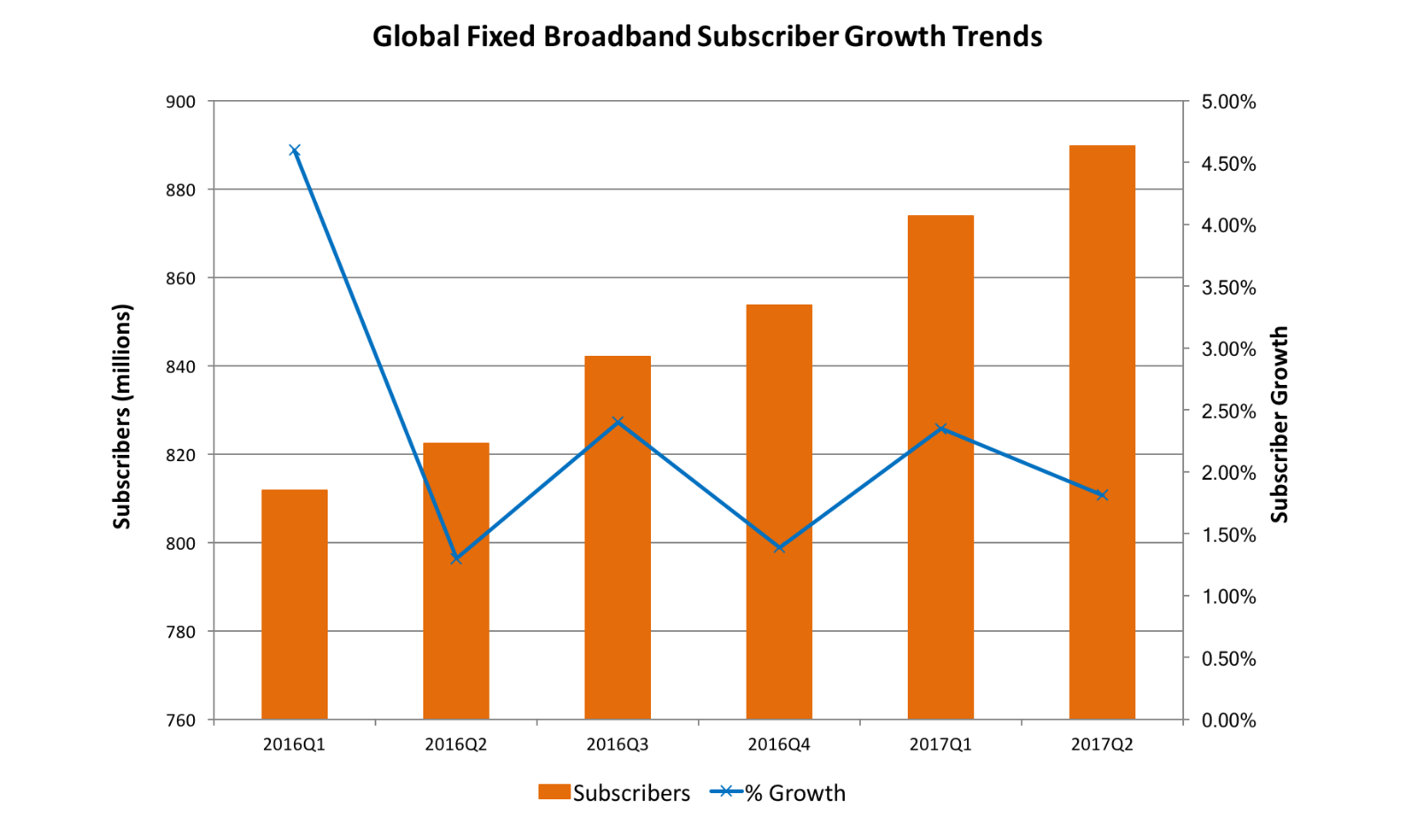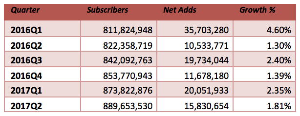ICCSZ訊(編譯:Vicki)在2017年第二季度末,固定寬帶用戶的季度增長率與上以季度相比有所放緩,并保持在1.81%,全球固定寬帶連接的數(shù)量為8.896億。