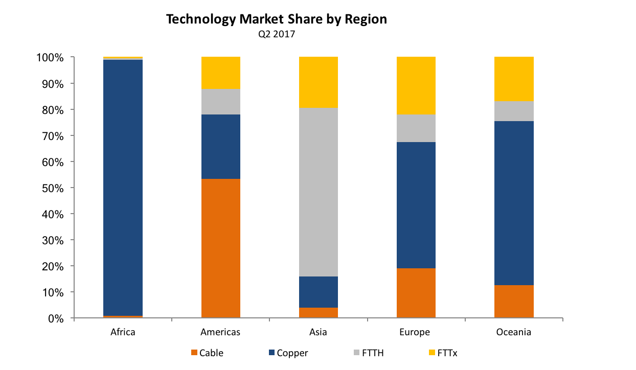 在所有地區(qū),以Copper為基礎(chǔ)的技術(shù)(DSL、ADSL和ADSL2+)的份額繼續(xù)下降。在2017年第二季度,在大洋洲和美洲尤其值得注意的是,VDSL在內(nèi)的FTTH和FTTx開始獲得更多的支持。在這兩個(gè)地區(qū),copper的份額分別下降了2.1%和1.5%(圖5)。