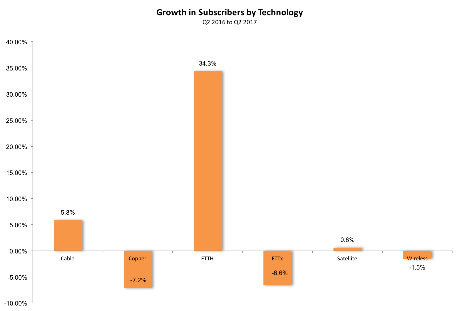 中國的固定寬帶用戶季度凈新增用戶數(shù)量也在全球范圍內(nèi)占據(jù)主導(dǎo)地位,主要是由大規(guī)模的FTTH推出。在2017年第二季度末的12個(gè)月里,中國增加了7100萬的FTTH連接。同時(shí),季度凈增在2017年第二季度在美國只有20%,2017年一季度凈增加和略低于2016年第二季度,cable運(yùn)營商和市場(chǎng)等巨頭例如AT&T的增長顯著放緩。