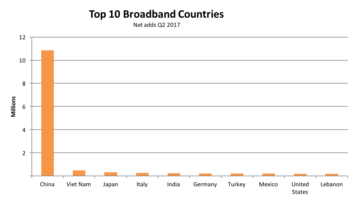 在截止到2017年第二季度末的12個(gè)月里,中國增加了100萬個(gè)FTTH連接,這個(gè)數(shù)值是印度和墨西哥的固定寬帶用戶總數(shù)的兩倍。