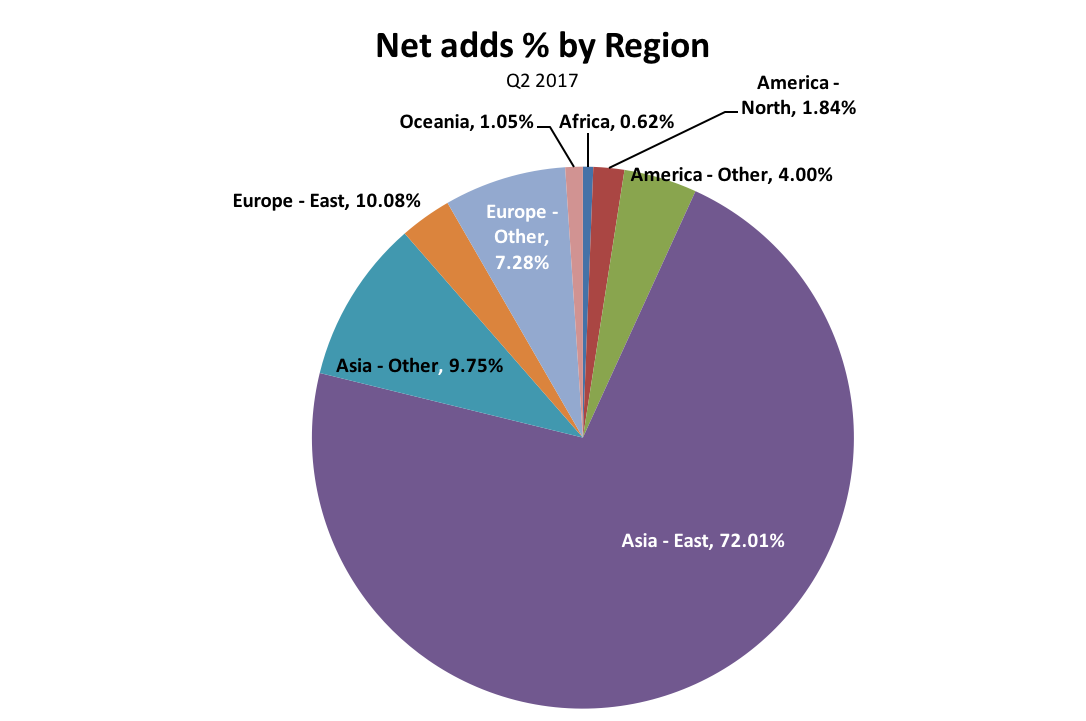 2017年第二季度,固定寬帶用戶中72%的新增用戶來自東亞(圖3),幾乎與2017年第一季度相同,該地區(qū)的季度增長率是所有地區(qū)中最高的,為3%。(圖4)